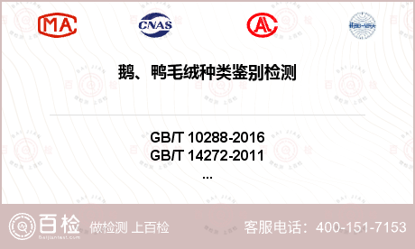 百檢網(wǎng)匯集眾多CNAS、CMA、CAL等資質(zhì)的檢測(cè)機(jī)構(gòu)遍布全國(guó),可為您提供鵝、鴨毛絨種類(lèi)鑒別測(cè)試服務(wù),實(shí)驗(yàn)室就近分配。具體請(qǐng)咨詢(xún)?cè)诰€(xiàn)客服。
