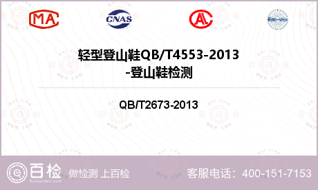 溫馨提示:以上關(guān)于《輕型登山鞋QB/T4553檢測》內(nèi)容僅為部分列舉供參考使用,百檢網(wǎng)匯集眾多CNAS、CMA、CAL等資質(zhì)的檢測機(jī)構(gòu)遍布全國,更多檢測需求請咨詢客服。