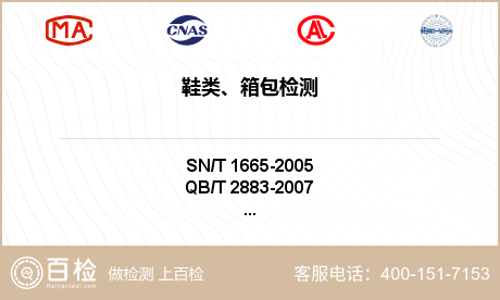 溫馨提示:以上關(guān)于《鞋類、箱包檢測(cè)》內(nèi)容僅為部分列舉供參考使用,百檢網(wǎng)匯集眾多CNAS、CMA、CAL等資質(zhì)的檢測(cè)機(jī)構(gòu)遍布全國(guó),更多檢測(cè)需求請(qǐng)咨詢客服。